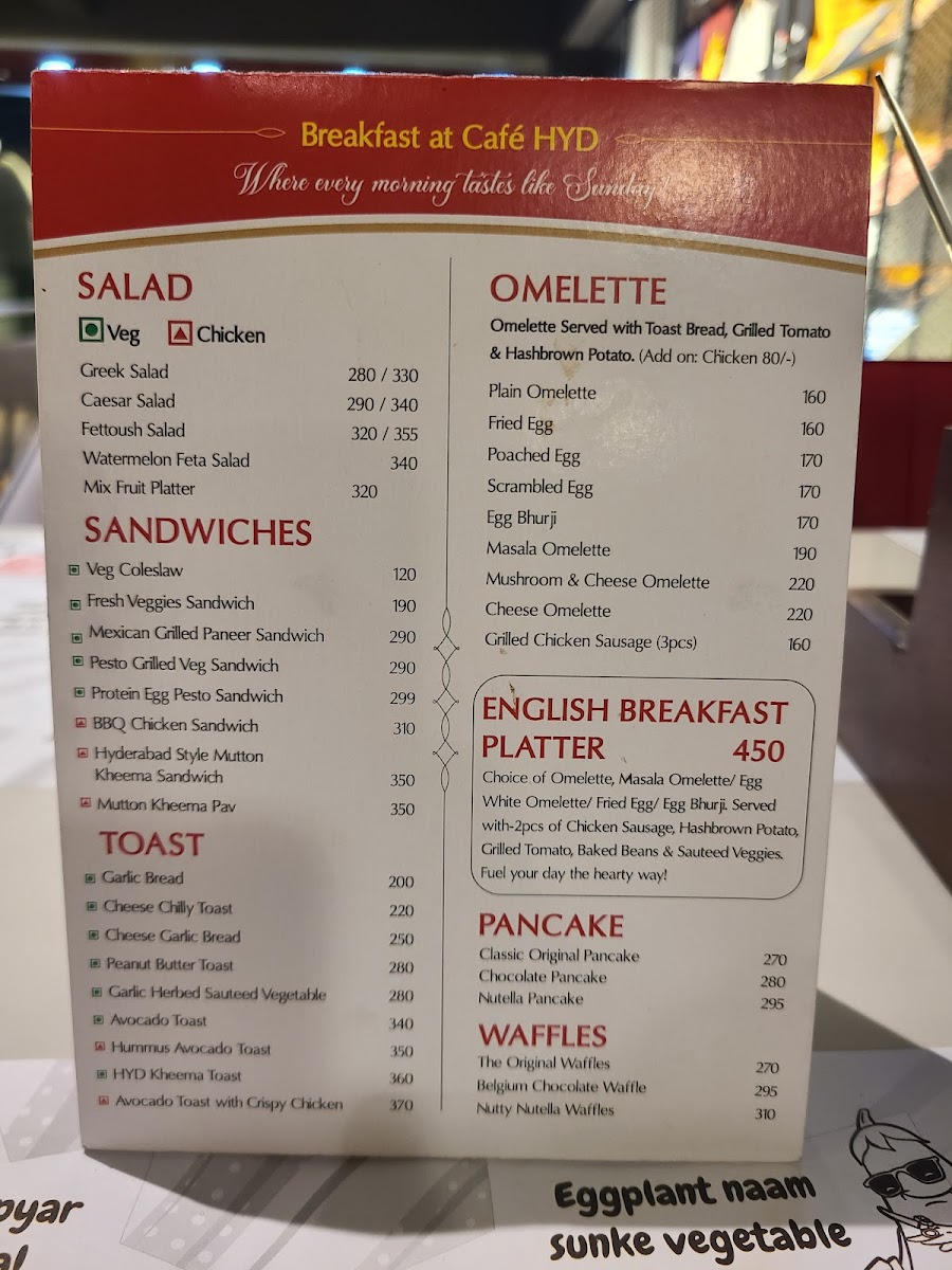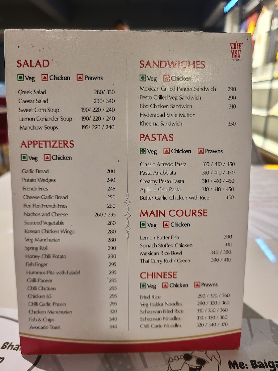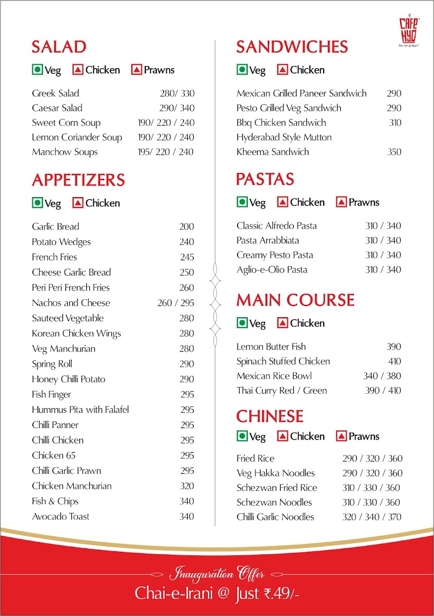 Cafe HYD boasts an impressive menu that showcases a curated selection of sandwiches, pastas, and Chinese dishes. Among the must-try offerings are the Hyderabad Style Mutton Kheema Sandwich, which bursts with rich, spiced flavors, and the decadent Classic Alfredo Pasta, creamy and satisfying in every bite. Vegetarians will delight in the Pesto Grilled Veg Sandwich, while those craving a taste of spice can savor the juicy BBQ Chicken Sandwich or the flavorful Chilli Garlic Noodles from their Chinese section.